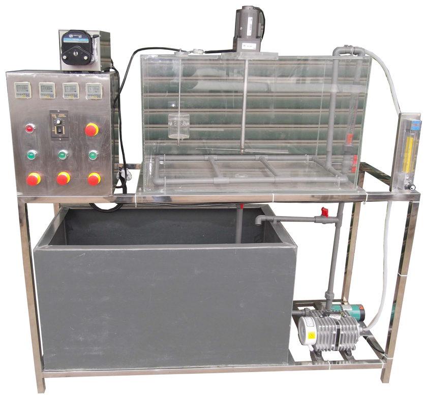反應(yīng)池、曝氣頭、抽吸泵、氣泵、水泵、流量計、配水箱、穿孔曝氣器、不銹鋼可移動框架、控制屏。