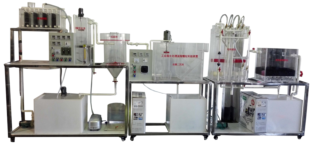 攪拌配水箱、格柵、旋流沉砂池、初沉池、電解槽、絮凝反應(yīng)斜板沉淀池、小型生化池、中型生化池、好氧生物反應(yīng)器、二沉池、生化池配水箱、小型進(jìn)水泵、回流泵、充氧泵、直流調(diào)節(jié)電源、流量計(jì)、簾式膜組件、陶瓷曝氣器、調(diào)速電機(jī)、可控硅無級(jí)調(diào)速器 、 電控箱、時(shí)間控制器、實(shí)驗(yàn)臺(tái)架、管道閥門。