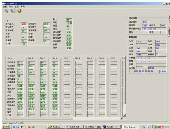 中央空調(diào)機(jī)由于工程復(fù)雜,設(shè)備分散,有的已經(jīng)裝修在開花板上測(cè)試程序,一但出現(xiàn)了故障,工程量相當(dāng)大,為了能夠快速準(zhǔn)確地測(cè)出故障是由主機(jī)機(jī)組還是室內(nèi)機(jī)的故障的,每個(gè)生產(chǎn)廠家根據(jù)生產(chǎn)的和維修的需要而開發(fā)了中央空調(diào)測(cè)試程序。可測(cè)試壓縮機(jī)的運(yùn)轉(zhuǎn)頻率,傳感器的各種數(shù)據(jù),電子膨脹閥的工作步數(shù)等幾十種中央空調(diào)的工作數(shù)據(jù)和狀態(tài),軟件可實(shí)現(xiàn)對(duì)內(nèi)機(jī)的控制, , 可以對(duì) 1-64 臺(tái)內(nèi)機(jī)的狀態(tài)進(jìn)行設(shè)定。是高校提供了好的研究的學(xué)習(xí)設(shè)備。