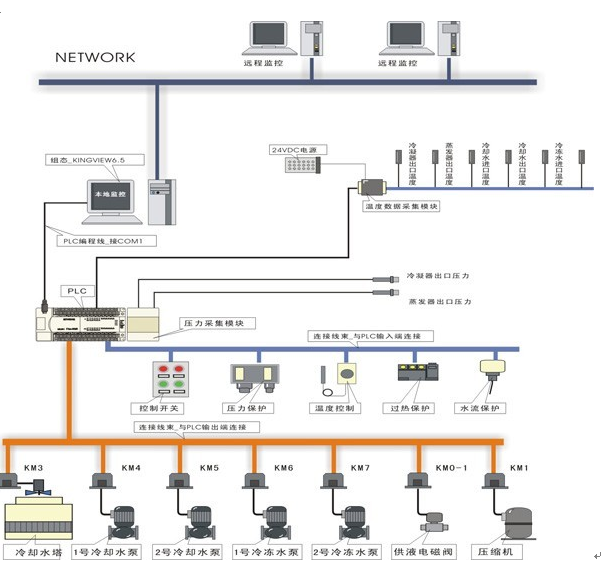 中央空調(diào)實訓(xùn)考核裝置(網(wǎng)絡(luò)型)要求系統(tǒng)采用 6 匹水冷機組,不銹鋼框架結(jié)構(gòu),終端建立一個專門房間進行客戶的模擬,大廳的模擬直接利用教室原來空間,采用分水器和集水器對冷量或熱量進行分配調(diào)節(jié),整個中央空調(diào)采用三菱 FX2n-48MR PLC 可編程控制器及工業(yè)總線控制,由計算機通過通信總線與 PLC 進行通信,控制整個中央空調(diào)的運行?照{(diào)的運行參數(shù)由各類傳感器進行采集,并通過通信總線送入計算機中,通過專用中央空調(diào)組態(tài)控制軟件進行實時監(jiān)控。組態(tài)軟件要求能夠以動畫的形式同步顯示系統(tǒng)的設(shè)備結(jié)構(gòu)、控制原理和流程。