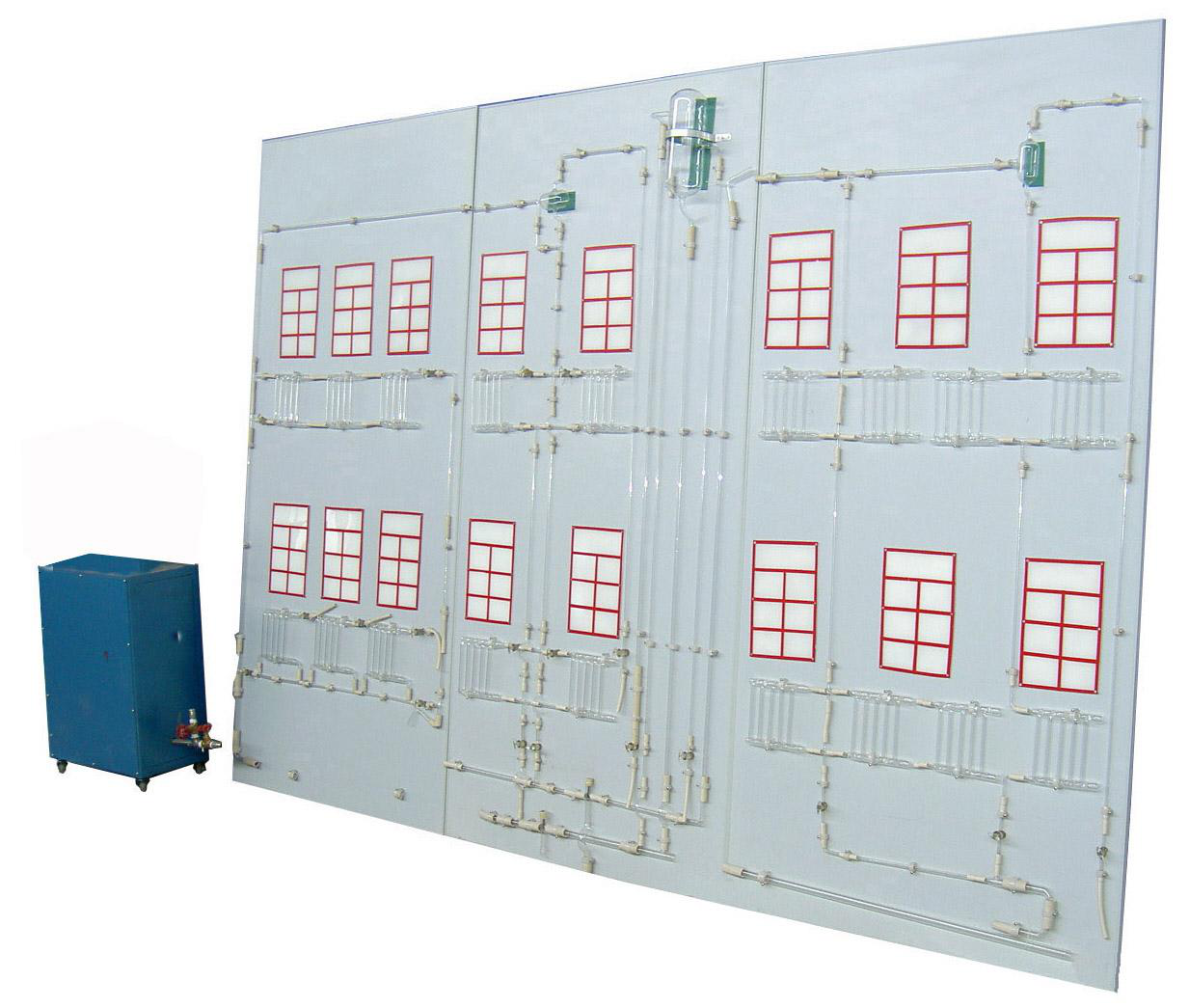 模擬采暖散熱器片、采暖供水干支管道、回水干支管道、集氣罐、高位膨脹水箱、溢水管、信號(hào)管、循環(huán)管、排水管、膨脹管、模擬房間墻面、模擬供暖鍋爐、供水泵、供水箱、實(shí)驗(yàn)臺(tái)框架等。