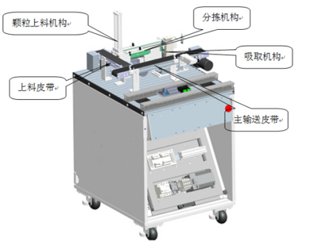 上料皮帶逐個(gè)將空瓶輸送到主輸送皮帶;同時(shí)顆粒上料機(jī)構(gòu)將料筒內(nèi)的物料推出;顆粒分揀機(jī)構(gòu)對(duì)顆粒物料根據(jù)顏色進(jìn)行分揀;當(dāng)空瓶到達(dá)填裝位后,皮帶停止,定位夾緊機(jī)構(gòu)將空瓶固定;吸取機(jī)構(gòu)將分揀到位的顆粒物料吸取放到空瓶?jī)?nèi);瓶子內(nèi)物料到達(dá)設(shè)定的顆粒數(shù)量后,定位夾緊機(jī)構(gòu)松開(kāi),皮帶啟動(dòng),將瓶子輸送到下一個(gè)工位。此單元可以設(shè)定多樣化的填裝方式,可從物料顏色(2種)、顆粒數(shù)量(最多4粒)進(jìn)行不同的組合,產(chǎn)生8種填裝方式。