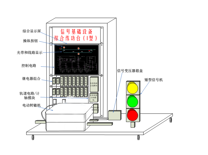 信號基礎(chǔ)設(shè)備綜合練功臺(I型)由信號組合柜、道岔控制組合板、信號繼電器、S700K三相交流電動轉(zhuǎn)轍機(jī)、軌道電路發(fā)送盒、接收盒、衰耗盒、電纜模擬網(wǎng)絡(luò)盤或計軸主機(jī)、計軸磁頭、矮型信號機(jī)、信號變壓器、燈絲繼電器、XB箱、線路及控制電路狀態(tài)顯示計算機(jī)、顯示屏、多路數(shù)字量驅(qū)動采集模塊、電源模塊、斷路器、練功平臺車等設(shè)備組成。設(shè)備外觀結(jié)構(gòu)如下圖所示。