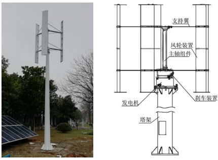 風(fēng)力發(fā)電系統(tǒng)由一臺(tái)5KW垂直軸風(fēng)力發(fā)電機(jī)組、尾翼、葉片、風(fēng)機(jī)控制器塔架等組成。