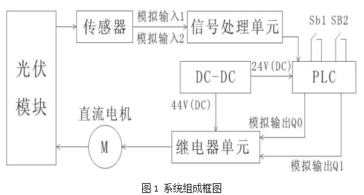 太陽能光照自動跟蹤控制系統(tǒng)由plc主控單元、光照度傳感器、方位傳感器和信號處理單元、光伏模塊、電磁機械運動控制模塊和電源模塊組成。系統(tǒng)的組成框圖如圖1所示。