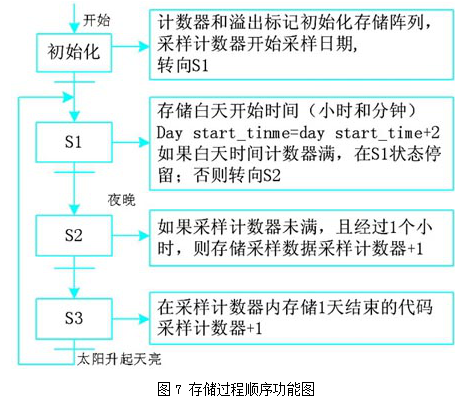 (3) 采樣數(shù)據(jù)存儲。這是一個在線采集存儲過程,通過ram數(shù)據(jù)存儲內(nèi)部的特殊矩陣,每一小時讀取光敏電阻的值。數(shù)據(jù)采集白天進行,晚上停止,直到第二天日出。采集的時間(小時和分鐘)存儲在不同的矩陣,然后在pc機的屏幕上顯示出來。當ram內(nèi)存滿時,將不再存儲數(shù)據(jù),直到復(fù)位操作將存儲數(shù)據(jù)清除。這部分程序采用順序功能圖表(sequential functioning chart,sfc)進行編程,算法如圖7所示。