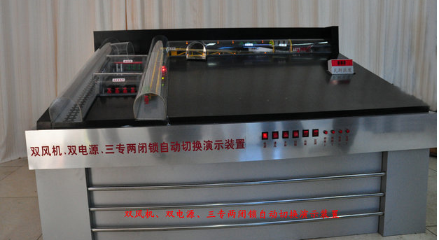 雙風(fēng)機(jī)、雙電源、自動(dòng)切換、三專二閉鎖演示裝置通過(guò)聲光機(jī)械控制技術(shù),顯示出了井下局部通風(fēng)機(jī)雙風(fēng)機(jī)、雙電源、自動(dòng)切換、三專二閉鎖系統(tǒng)的布置,運(yùn)行方式。