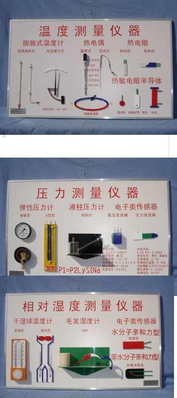 熱工類測量儀器示教板,分為溫度測量示教板;壓力測量示教板;相對濕度測量示教板;流量測量示教板。