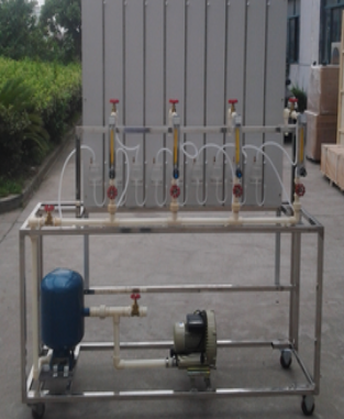 不銹鋼實(shí)驗(yàn)臺(tái)、旋渦氣泵、穩(wěn)壓罐、供氣干管、用戶支管、用戶流量計(jì)、壓差板、單管壓力計(jì)等組成。氣泵工作產(chǎn)生的氣流進(jìn)入穩(wěn)壓罐,經(jīng)瀉流穩(wěn)壓后,供給模擬的燃?xì)庥脩簦總(gè)用戶由支管、流量計(jì)和尾閥組成,在壓差板上設(shè)有9只單管壓力計(jì),可分別測(cè)量干管起點(diǎn)的壓力、用戶支管及包含燃具的阻抗在內(nèi)的壓差,而第9只壓力計(jì)則既測(cè)量最終用戶的阻抗,又是干管的終點(diǎn)壓力。通過調(diào)整瀉流閥、用戶流量及尾閥進(jìn)行實(shí)驗(yàn)。