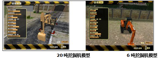 2、該挖掘機(jī)模擬軟件提供二種不同型號(hào)(6噸、20噸)的挖掘機(jī)3D模型供學(xué)員選擇練習(xí)。