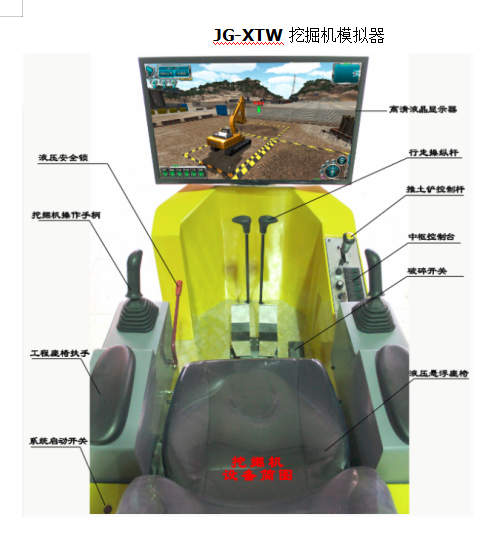 該設(shè)備硬件由設(shè)備底座、駕駛座艙、駕駛座椅、PC系統(tǒng)、視景顯示器、高靈敏度操作手柄、360度視角搖桿、行走操作桿,液壓安全鎖桿,數(shù)據(jù)采集系統(tǒng)及各種功能控制按鈕等組成。設(shè)備采用與真實(shí)挖掘機(jī)相同的操作部件,逼真的操作手感,使得其操作功能、操作感覺與真機(jī)完全吻合;