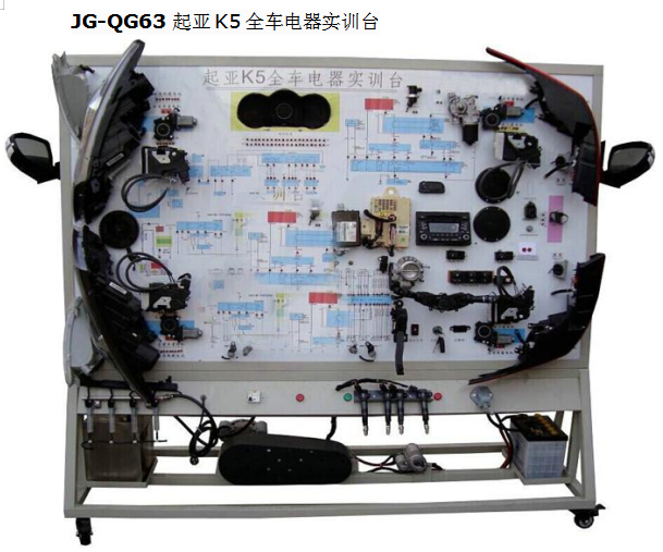 起亞K5全車電器實訓臺采用全新起亞K5整車電器實物為基礎(chǔ),充分展示汽車發(fā)動機防盜系統(tǒng)、儀表系統(tǒng)、燈光系統(tǒng)、雨刮系統(tǒng)、喇叭系統(tǒng)、點火系統(tǒng)、電動車窗系統(tǒng)、電動門鎖、音響系統(tǒng)、起動系統(tǒng)和充電系統(tǒng)等汽車電器各系統(tǒng)的組成結(jié)構(gòu)和工作過程。