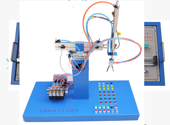 13 、 氣動機(jī)械手實(shí)訓(xùn)模型 (實(shí)物) : 本實(shí)訓(xùn)模型是一套完整的氣動機(jī)械手搬運(yùn)裝置,由安裝底板、氣動手指、單桿提升氣缸、雙導(dǎo)桿伸縮氣缸、旋轉(zhuǎn)擺動氣缸、多種類型磁性傳感器、多種類型電磁閥、空氣過濾器、氣源控制滑閥及接線端子排等組成。主要完成物料的搬運(yùn)功能,氣動機(jī)械手通過前臂下降,氣動手指夾緊物體,手臂縮回,手臂右擺,手臂前伸,前臂下降,手爪松開將物體放到指定位置等動作后,機(jī)械手返回原位。將電磁閥及磁性開關(guān)等元件的引出線連接到相應(yīng)的端子接線排上,方便使用。能滿足職業(yè)院?删幊炭刂破、機(jī)電一體化、氣動技術(shù)等相關(guān)課程的實(shí)訓(xùn)教學(xué)?刂齐娫矗 DC 24V