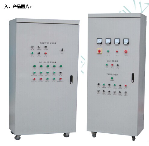 1. 本裝置采用標(biāo)準(zhǔn)配電柜為主體柜,充分利用該柜雙面空間位置,設(shè)有一臺(tái)銑床、一臺(tái)車床、一臺(tái)鏜床、一臺(tái)磨床,該配電柜將四種機(jī)床電氣線路合為一體,各種機(jī)床占地面積小,外形美觀;